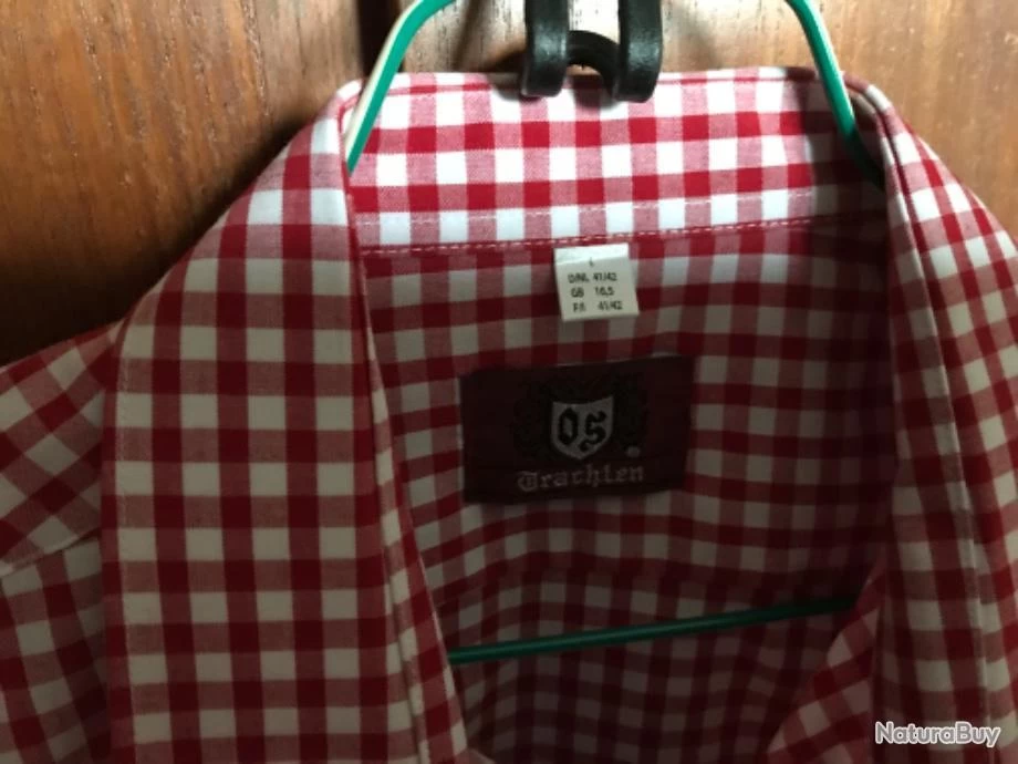 Chemise vichy rouge / blanc typique de l’habillement traditionnel autrichien – déballée mais jamais portée – taille française 41/42 – boutons en bois de cerf – poche poitrine avec broderie