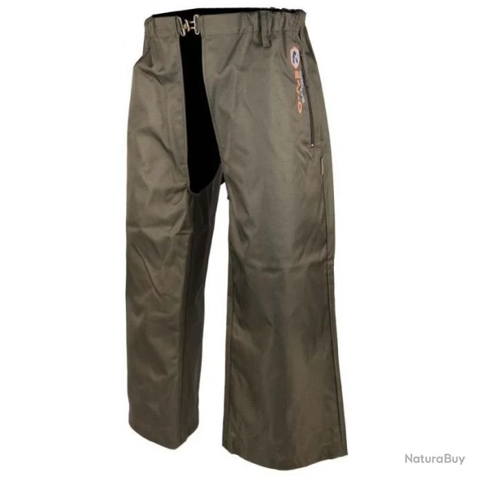 100% polyester anti-ronce imperméable.Cuissard antironce épais. Couleur vert. Tissu EVO, tramage croisé. Doublé sur l’avant anti-ronce. Ceinture élastique. 2 repose-mains zippés.