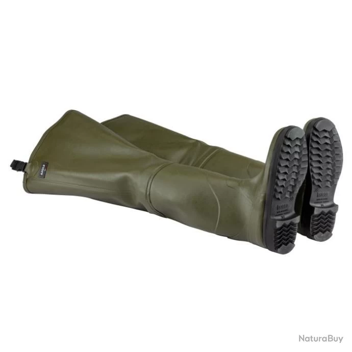 Grâce à sa semelle en caoutchouc résistante à l’abrasion. Un insert de limaille de fer a été ajouté pour une plus grande stabilité. Elle est dotée d’une attache rapide en haut pour garantir un très bon maintien. La doublure de la cuissarde est en coton pour le confort. Cuissarde caoutchouc confectionnée à la main par les maîtres caoutchoutiers en France