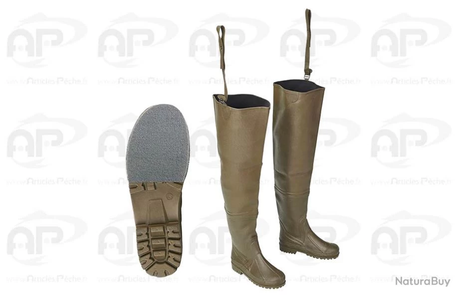 Les bottes comportent des renforts au niveau du talon, de la pointe et du coup du pied, ce qui assure un bon maintien pendant les déplacements. La couleur verte de ces cuissardes en caoutchouc naturel permet de se rendre discret à la fois sur les bordures mais aussi dans l’eau. L’utilisation de semelle crantée sur le talon et recouverte de feutre sur la partie avant, garantit une accroche correcte sur les sols boueux, mais et principalement destinée aux cours d’eau ayant des fonds couverts de gros cailloux et rochers pas toujours très stables et qui peuvent être très glissants.