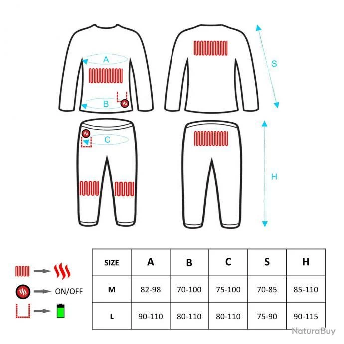 - éléments chauffants: 10 W (chemise) et 11,5 W (pantalon) – fibre de carbone